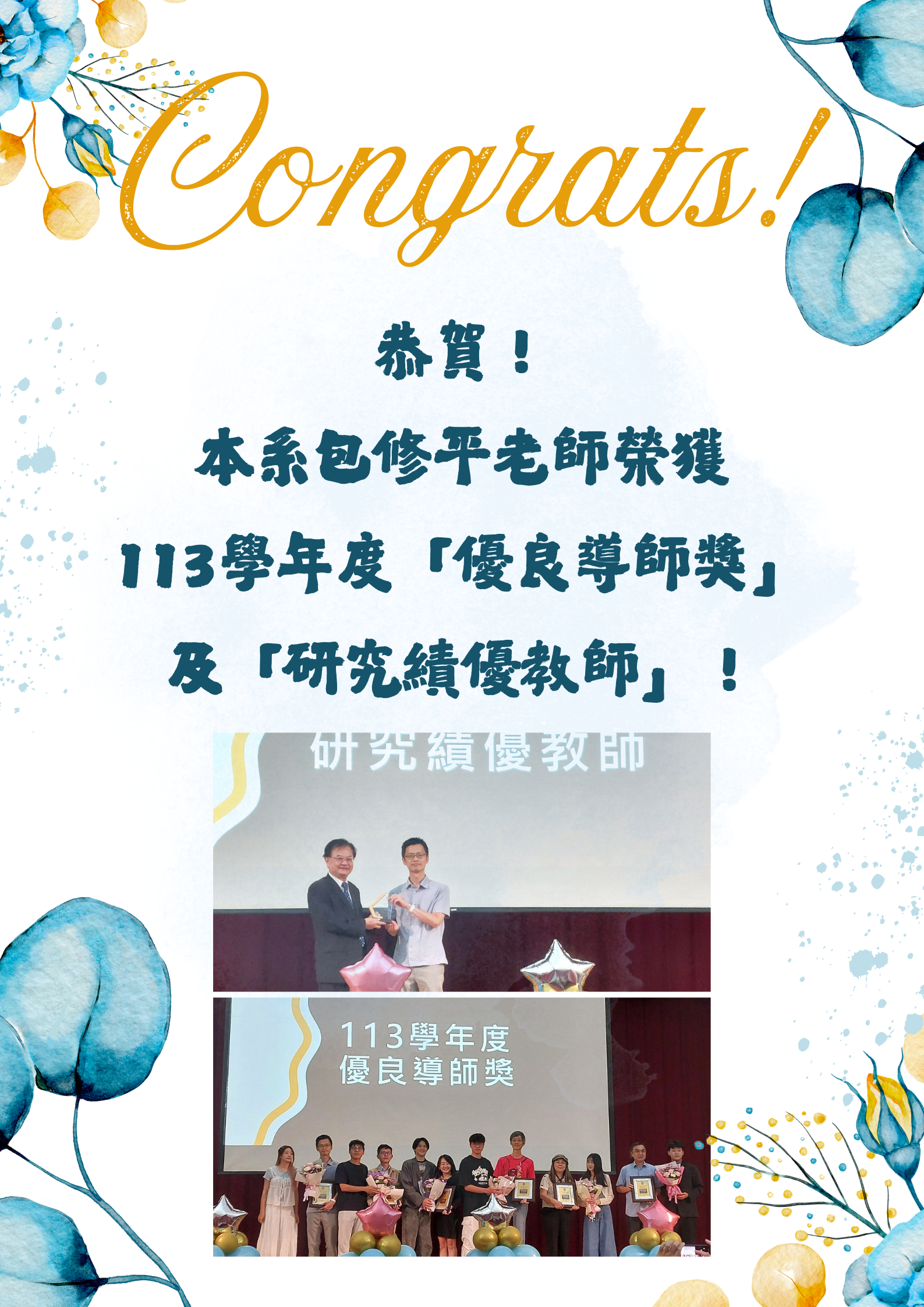 恭賀! 本系包修平老師榮獲 113學年度「優良導師獎」 及「研究績優教師」!