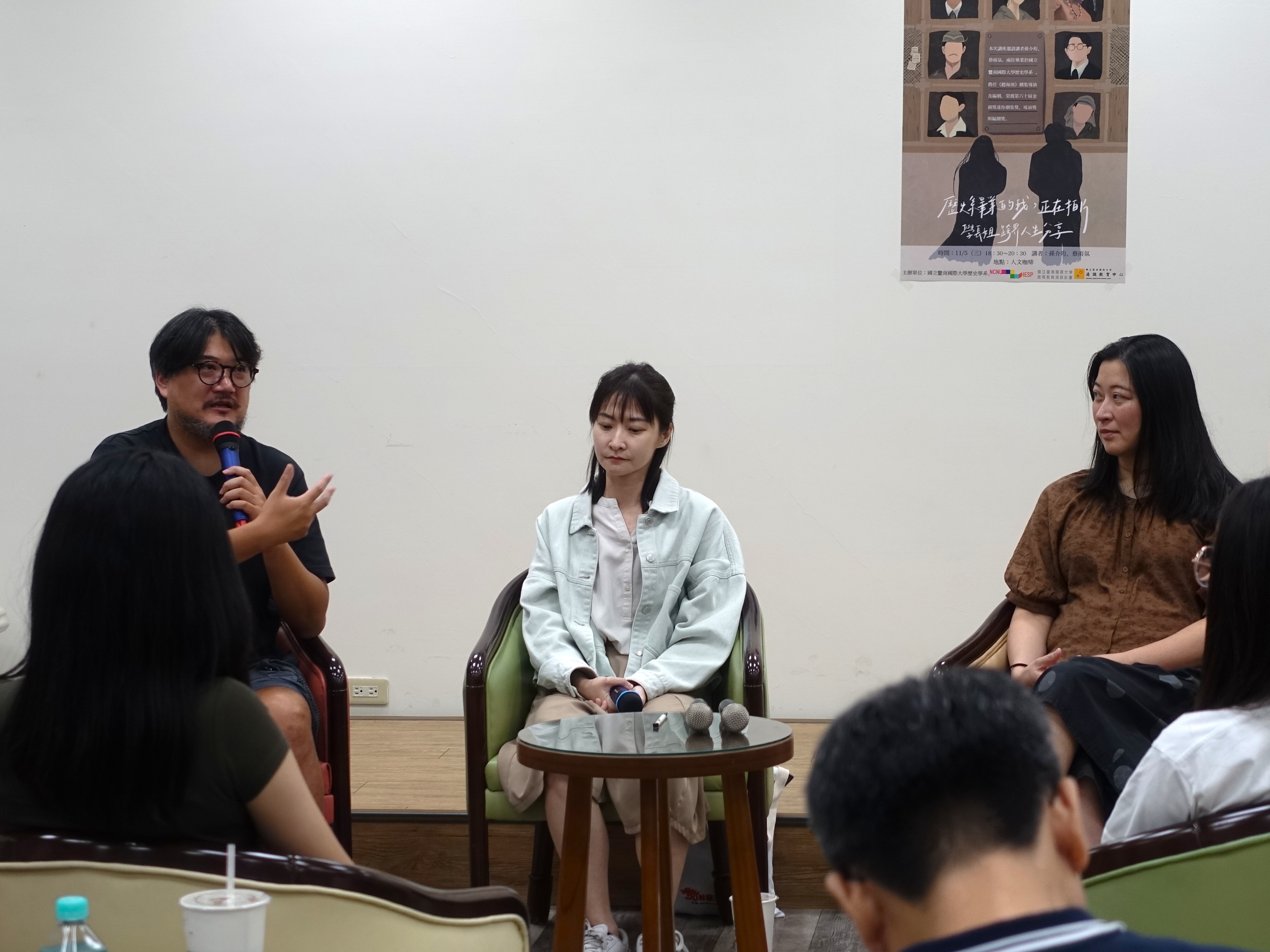11月5日晚間,本系邀請系友孫介珩導演及蔡宜芬編劇返校,以「歷史系畢業的我,正在拍片— 《聽海湧》編導跨界人生分享」為題,與學弟妹分享在學期間及職涯轉變的心路歷程。
